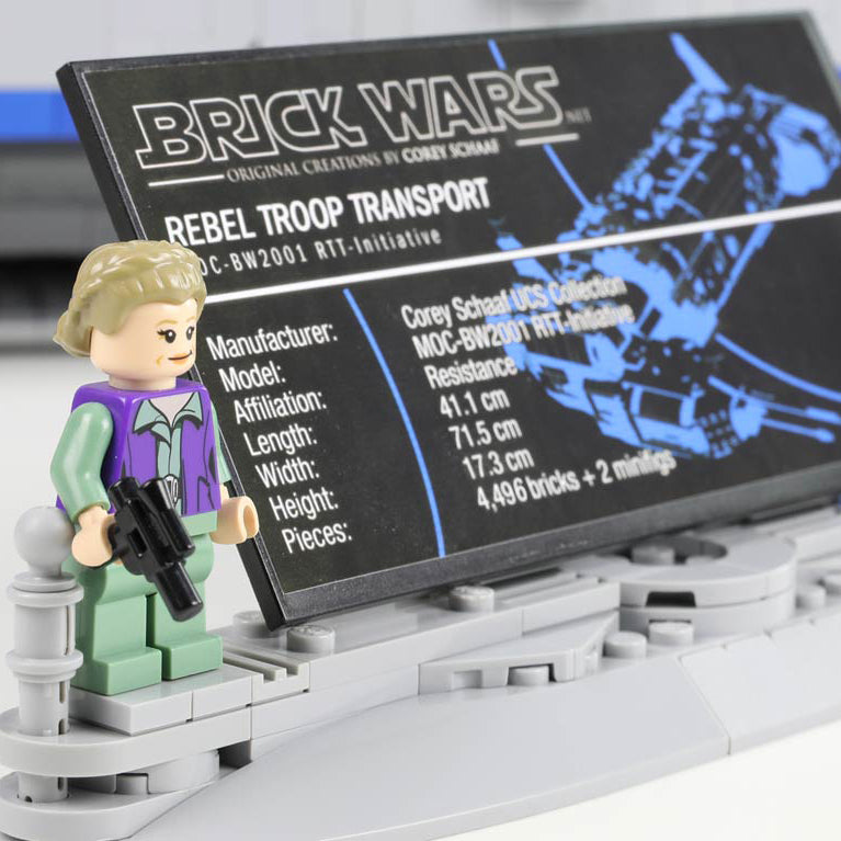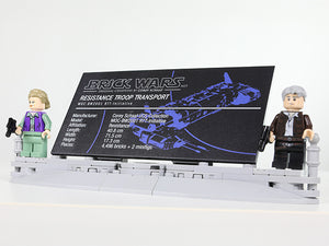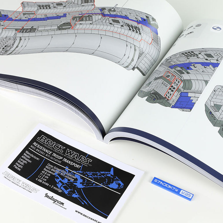 Professionally produced high resolution step-by-step instruction manual of the Resistance Troop Transport ship from Star Wars: The Force Awakens. Each manual includes a custom UCS Sticker and unique 1 x 6 tile with your ship's call sign.