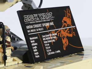 Professionally produced high resolution step-by-step instrucion manual of the Kintant Strider Speeder Bike from Star Wars: The Book of Boba Fett. Each manual includes a custom UCS Sticker and unique 2 x 3 tile with your bike's manufactuer's ID.