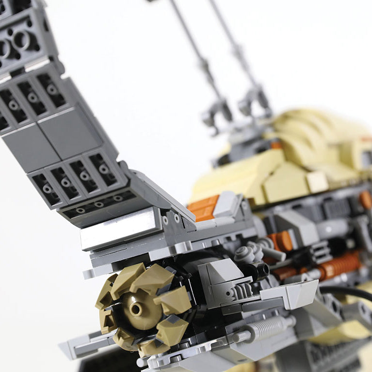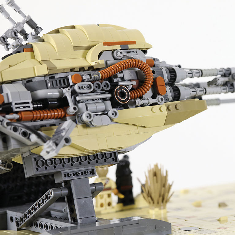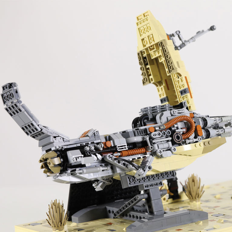 The bike was designed to look as though it's flying through the deserts of Tatooine using a similar design stand to the UCS LEGO® A-Wing. I wanted the color of the bike to mimic the landscape colors of the desert. The design features an adjustable seat, foot pedals that open and close for a second passenger as well as an engine hood that reveals some additional engine details.