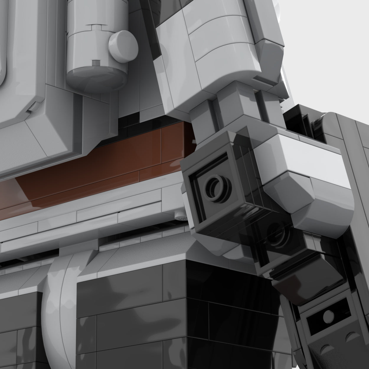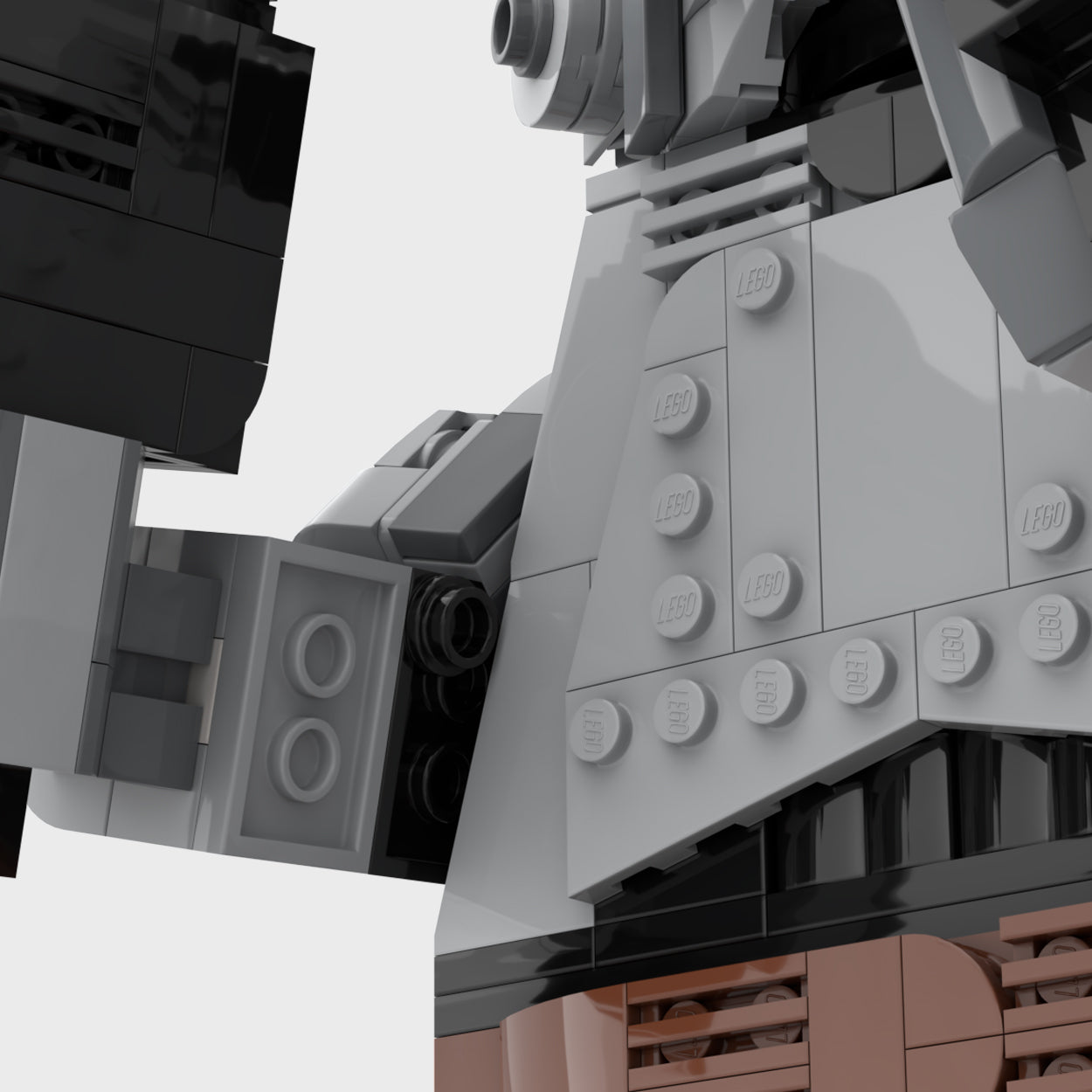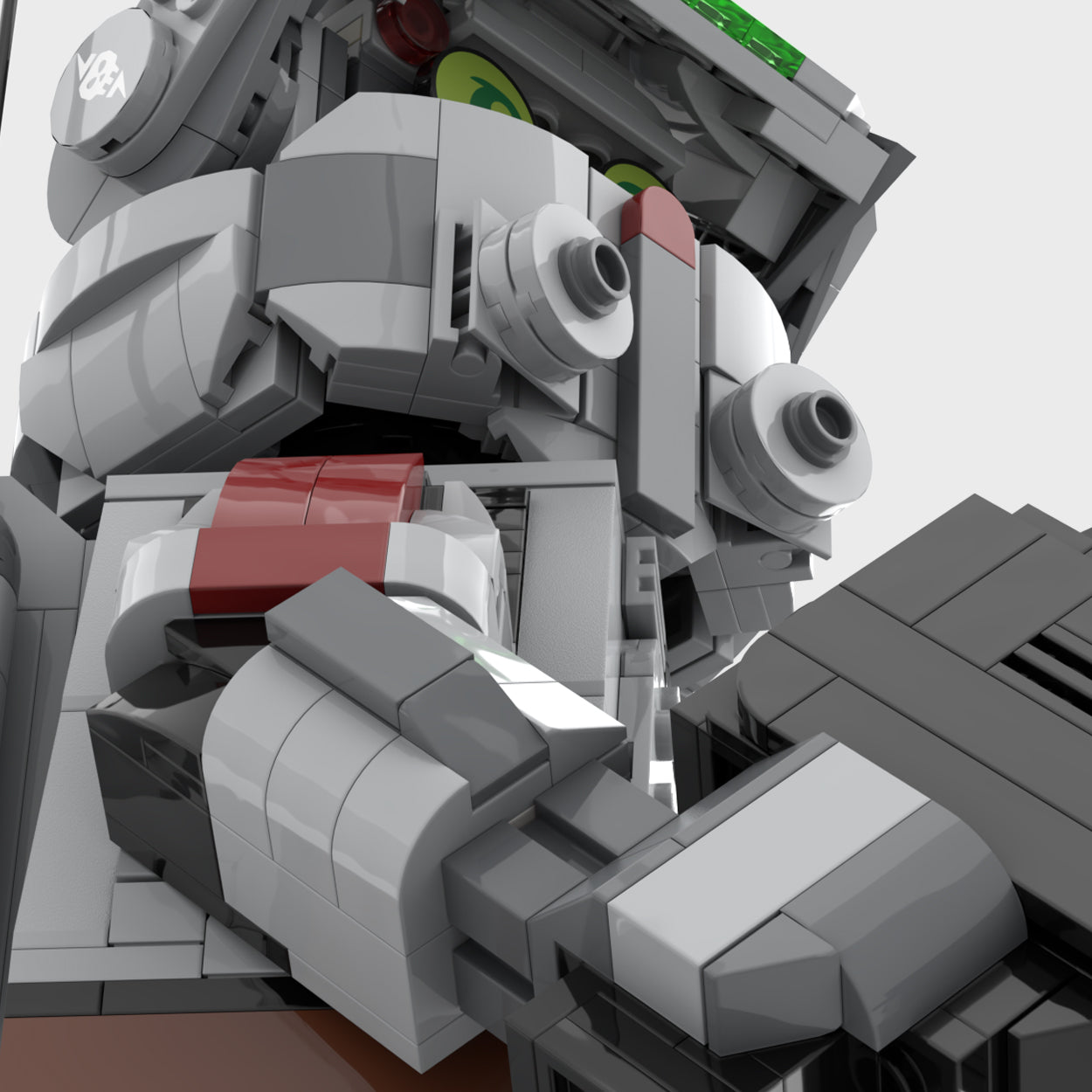 This design features articulating legs and arms as well as a head that can move almost 360 degrees. While the figure can be posed it is most stable with arms in the resting position. The internal gear system allows arms and legs to be posable. However, the weight of the guns can cause the arms to fall to a resting position. Depending on how new your parts are, the gear system did hold at 22.5 degrees, but over time will likely fall back to a resting position. However, a 1 x 1 round plate can be used as a stop block to hold the arms in multiple positions. The stop block can easily hold the weapons in a firing position.